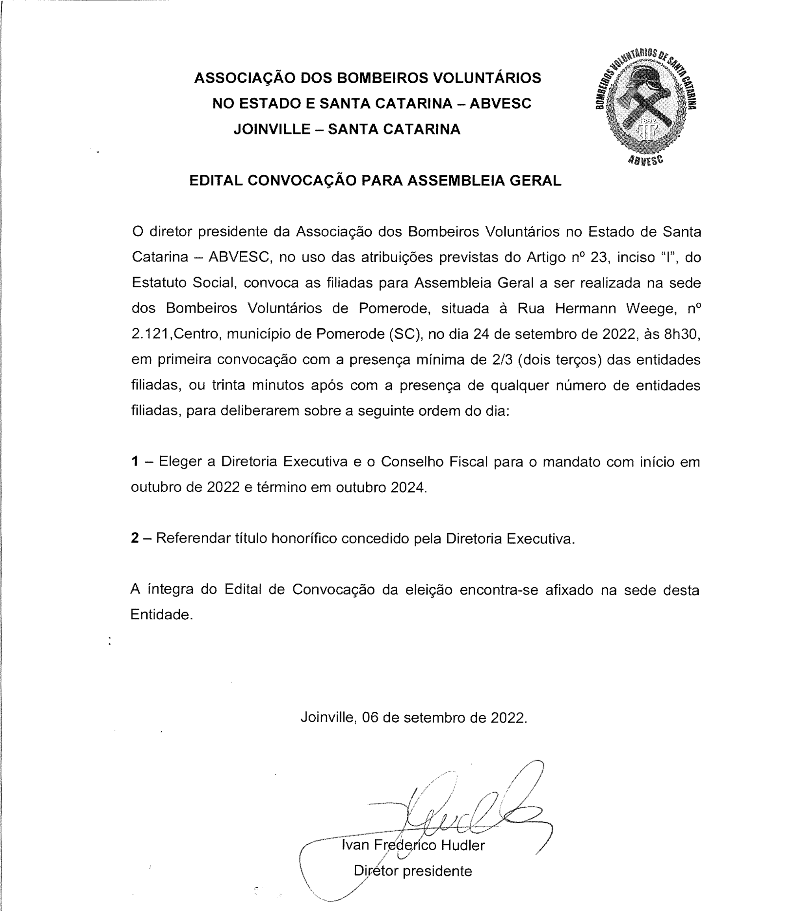 A Associação dos Bombeiros Voluntários no Estado de Santa Catarina – ABVESC realiza no dia 24 deste mês Assembleia Geral para eleição da diretoria para o biênio 2022-2024 e referendar a concessão de título honorífico concedido pela diretoria executiva. O edital foi publicado em veículo de comunicação, conforme o estatuto da Associação, no dia 9 passado (leia íntegra ao lado).