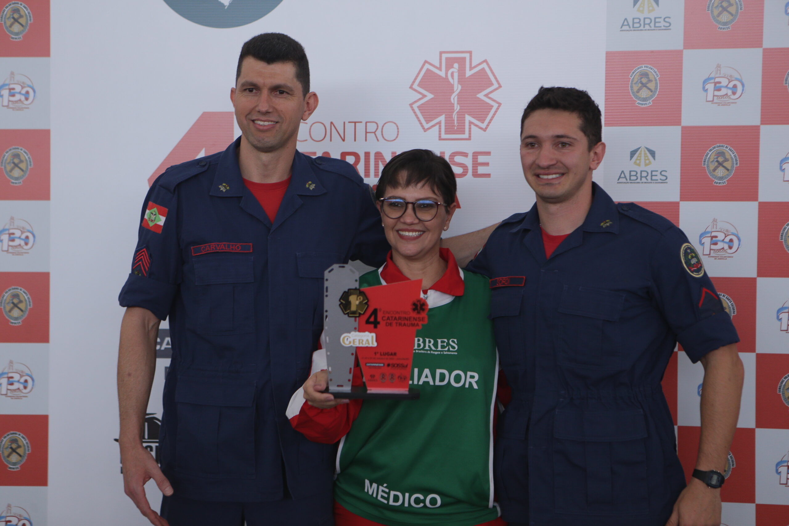 Equipe Condá Alfa – 2º sargento BM Cleber Rocha Carvalho e o soldado BM Elielson Márcio Sordi – do 6º Batalhão de Bombeiro Militar de Chapecó (CBMSC) foi a campeã geral do 4º Encontro Estadual de Trauma. Troféu foi entregue pela representante da ABRES, coronel BM Karina Ferreira Ribeiro