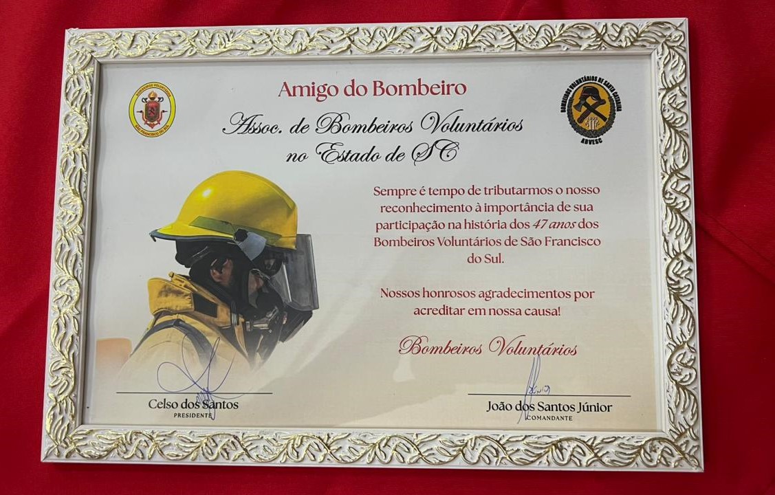 A cerimônia foi marcada por 43 homenagens a bombeiros por tempo de serviço, além da entrega do certificado “Amigo do Bombeiro” a órgãos públicos e privados que apoiam a Associação de São Francisco do Sul, entre elas, a ABVESC. O comandante da corporação, João dos Santos Júnior, destacou a importância das ações em reconhecimento ao apoio da comunidade, além de “comemorar e confraternizar com todos o aniversário de 47 anos da instituição.”