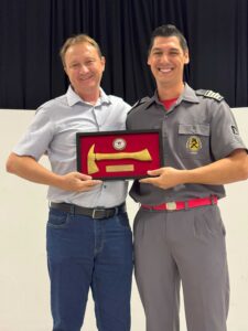 Agradecimento – Na mesma cerimônia, a corporação prestou homenagem ao ex-presidente da Associação (2014-2018), Dieter Helmuth Gadtke. Ele recebeu a Machadinha Dourada – que representa o trabalho realizado em favor dos Bombeiros Voluntários de Guaramirim –, das mãos do comandante Maicon Rodrigo Ewald. De acordo com o comandante, a gestão de Gadtke é vista como um “divisor de águas” na corporação. “Ele adotou estratégias de gestão que tornaram a nossa unidade uma referência, além de se mostrarem resultados até os dias atuais.”