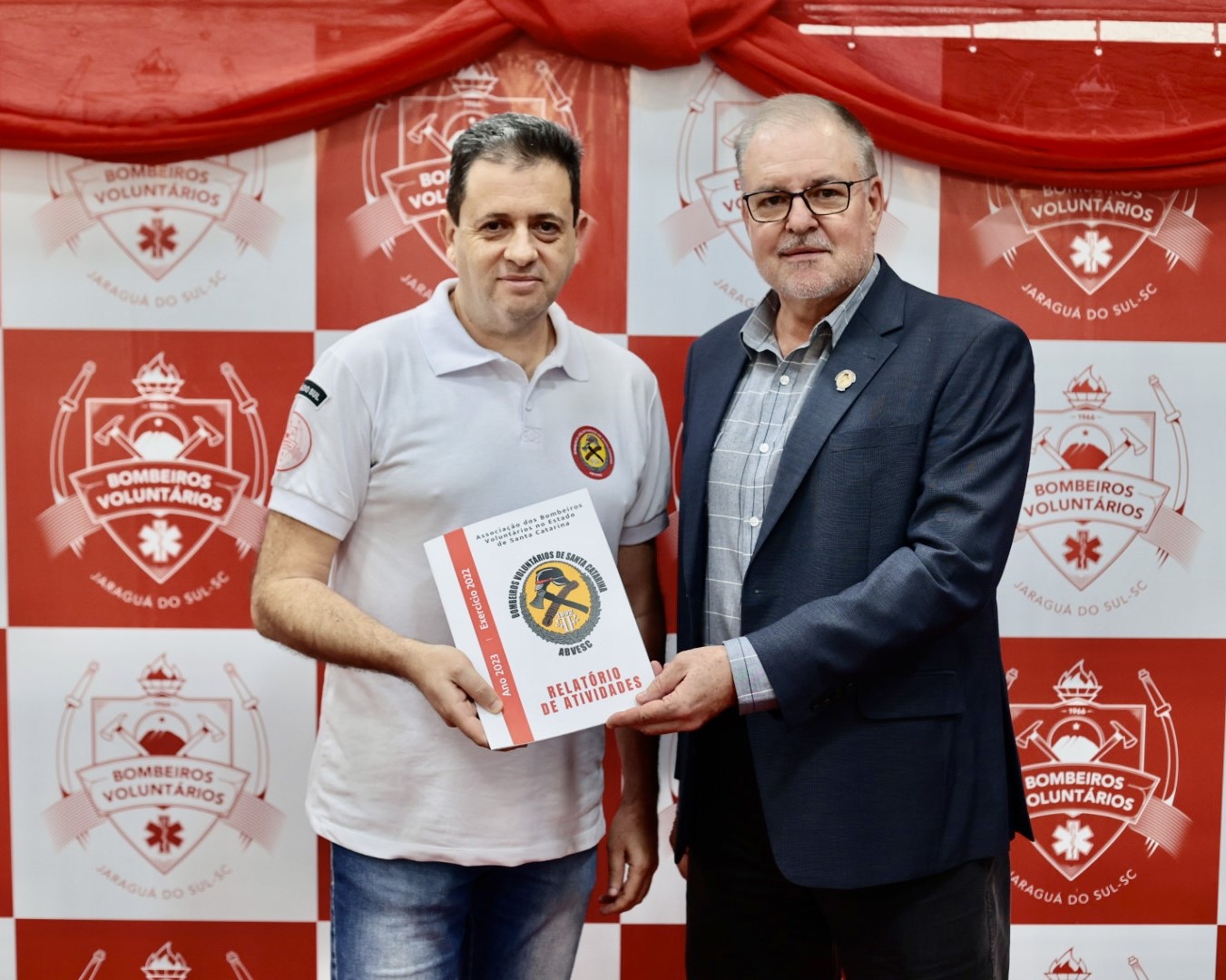 Presidente da ABVESC, Ivan Frederico Hudler, entregou o Relatório de Atividades 2023 para o presidente dos Bombeiros Voluntários de Jaraguá do Sul, Giocondo Tagliari Calomeno