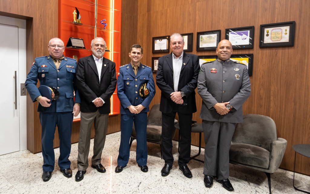 O presidente da ABVESC, Ivan Frederico Hudler (segundo à dir), o coordenador do Conselho dos Comandantes e comandante dos Bombeiros Voluntários de Indaial, Evandro Vinotti (à dir), o Tenente Coronel BM Jorge Arthur Cameu Júnior, comandante da 1ª Região de Bombeiro Militar do Corpo de Bombeiros Militar de Santa Catarina (Centro) e o subtenente BM Israel Machado foram recepcionados por Moacir Thomazi