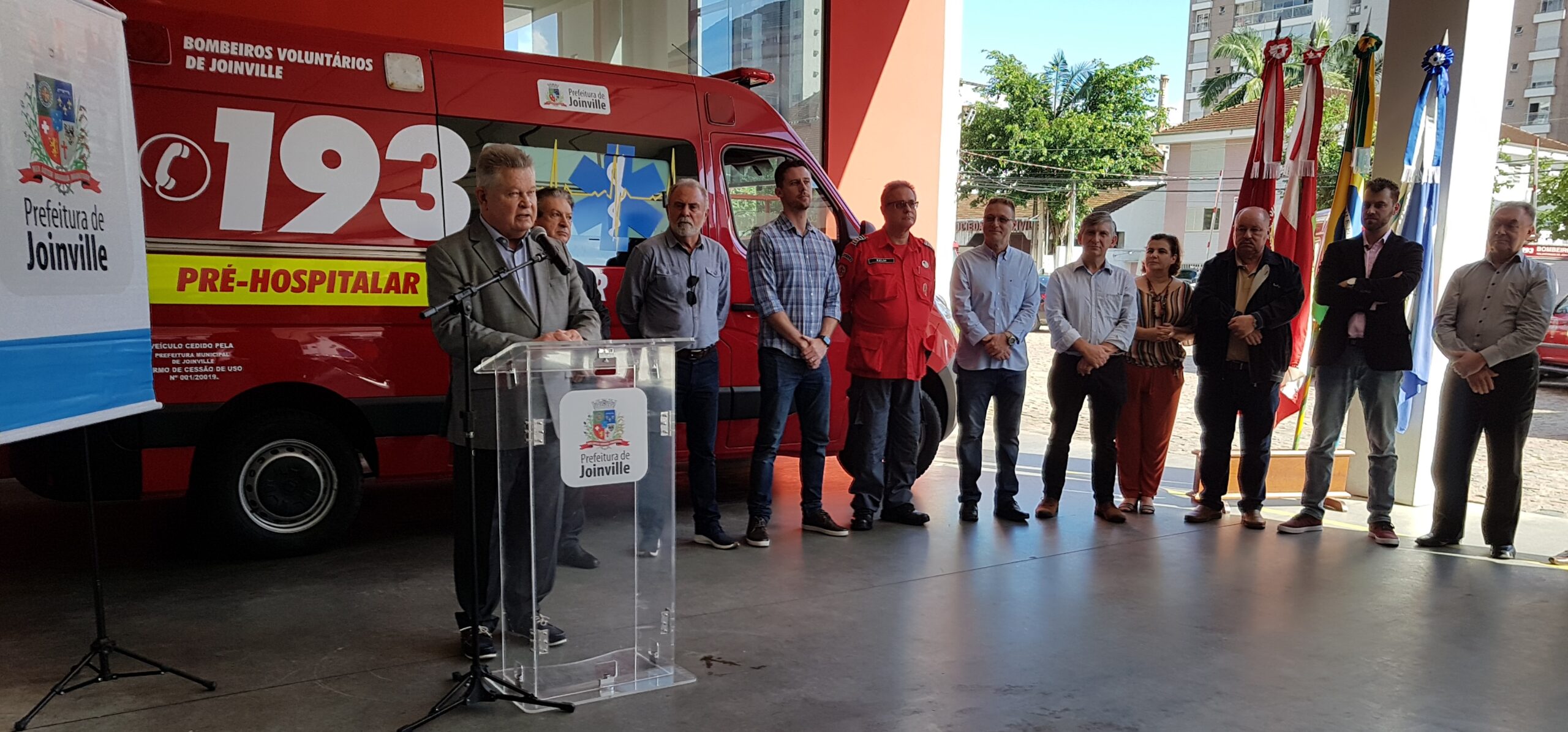 O Corpo de Bombeiros Voluntários de Joinville (CBVJ) recebeu em cessão de uso da Prefeitura uma ambulância, nesta segunda (20 maio), por meio de acordo de cooperação com o Fundo Municipal de Saúde. A solenidade de entrega ocorreu na unidade central do CBVJ e teve a presença do prefeito Udo Döhler, deputado estadual Fernando Krelling, do presidente da Associação Corpo de Bombeiros Voluntários de Joinville, Moacir Thomazi, de membros da corporação, lideranças de entidades representativas e autoridades locais.