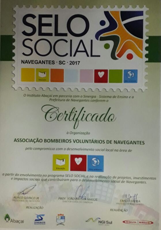No último dia 21 os Bombeiros Voluntários de Navegantes foram reconhecidos com a certidão do Selo Social. O Selo Social é uma certificação concedida a empresas, entidades sociais e órgãos públicos que demostrem Compromisso Social e foi criado para reconhecer iniciativas que promovam o desenvolvimento e a melhoria da qualidade de vida da população local.