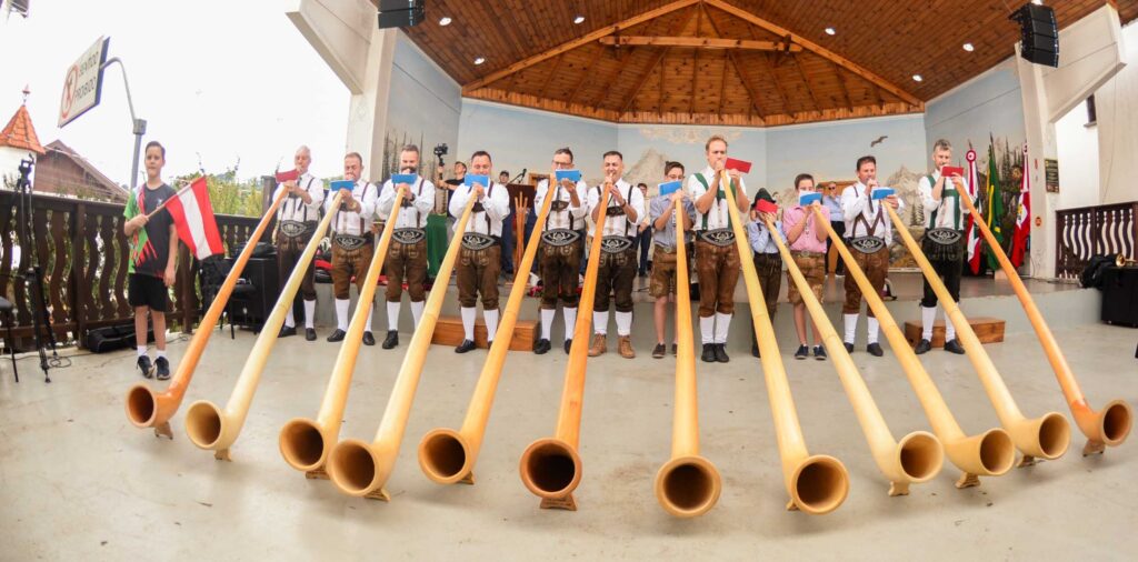 Apresentação musical com o Alpenhorn pelo idealizador do Corpo de Bombeiros de Treze Tílias, Conrado Moser, e seu grupo