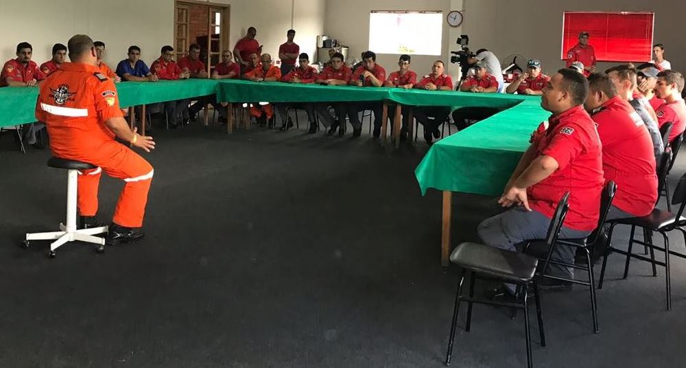 Comandante Evandro Vinotti (centro, de macacão alaranjado) passou instruções para o grupo durante a manhã