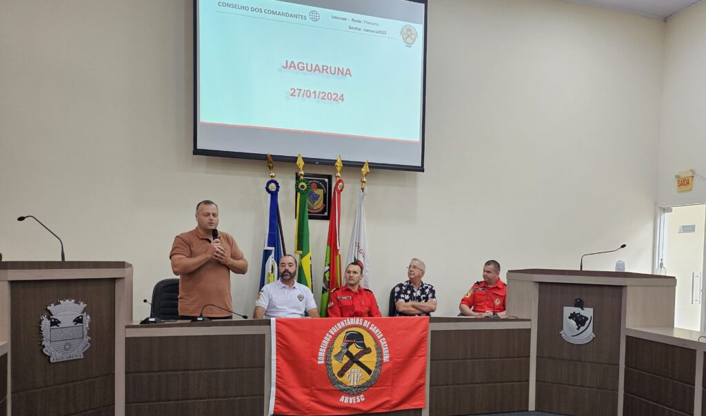 O Conselho dos Comandantes, da Associação dos Bombeiros Voluntários no Estado de Santa Catarina (ABVESC), abriu o calendário de reuniões anuais, na manhã de sábado (27/01/2024), recepcionado pela corporação dos Bombeiros Voluntários de Jaguaruna, corporação do Litoral Sul do Estado e pertencente a Regional Indaial. O encontro extraordinário, realizado na Câmara de Vereadores, fez parte da agenda de 2023, que teria ocorrido em novembro, e remarcado em função dos eventos climáticos adversos.