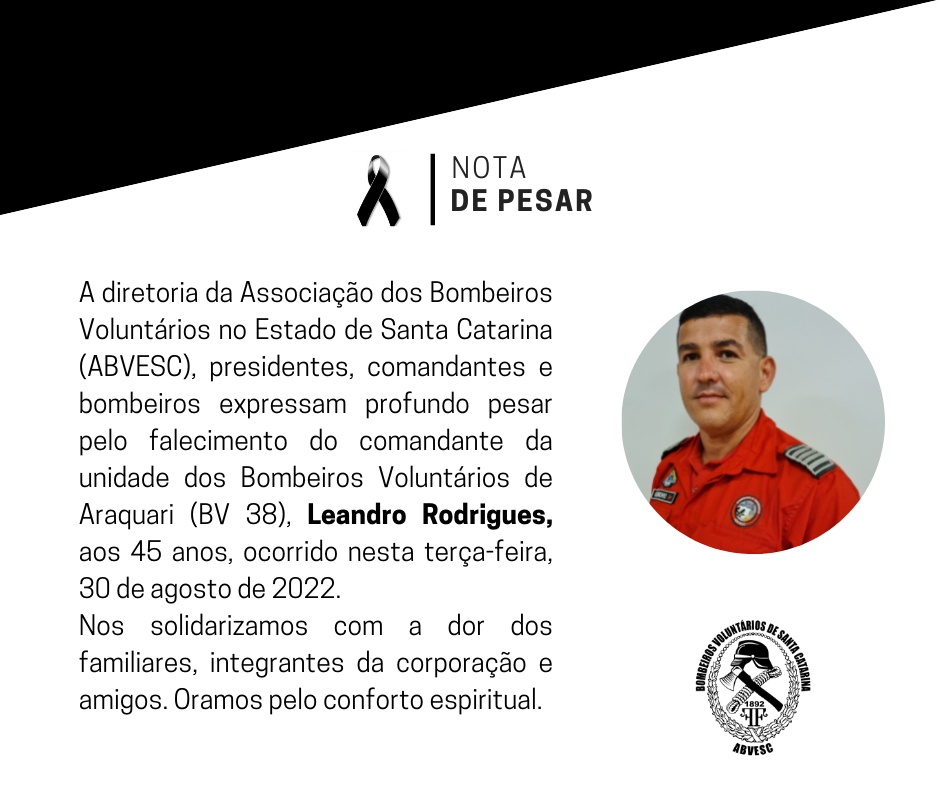 A Associação Corpo de Bombeiros Voluntários Araquari informa que nesta data (30 de agosto de 2022) faleceu o comandante dos Bombeiros Voluntários de Araquari, Leandro Rodrigues, aos 45 anos.